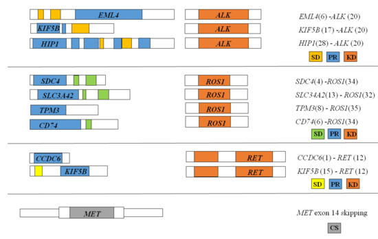 Schematic representation of gene fusions reported in a routine sample set: The kinase domain is in orange; the promoter region is in blue; the structural domains are in yellow, ochre, and green; the coding sequence is in grey. Abbreviations: ALK: Anaplastic Lymphoma Kinase; CCDC6: Coiled-Coil Domain Containing 6; CD74: CD74 Molecule, Major Histocompatibility Complex, Class II Invariant Chain; CS: sequence; EML4: Echinoderm Microtubule Associated Protein Like 4; HIP1: Huntingtin Interacting Protein 1; KD: kinase domain; KIF5B: Kinesin Family Member 5B; MET: MET Proto-Oncogene, Receptor Tyrosine Kinase; PR: promoter region; RET: Rearranged During Transfection; ROS1: ROS Proto-Oncogene 1, Receptor Tyrosine Kinase; SD: structural domain; SLC34A2: Solute Carrier Family 34 Member 2; SDC4: Syndecan 4; TPM3: Tropomyosin 3.