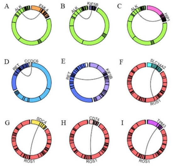 Circos plots representation of the gene fusions reported in routine sample set by using the R circlize package (R Core Team v3.6.1) [32]. (A–C) shows ALK translocations and corresponding fusion partners detected in analyzed samples. (D,E) shows RET fusions and gene partners identified in sample population. (F–I) shows ROS1 translocations and fusion partners inspected in analyzed samples. Abbreviations: ALK: Anaplastic Lymphoma Kinase; CCDC6: Coiled-Coil Domain Containing 6; CD74: CD74 Molecule, Major Histocompatibility Complex, Class II Invariant Chain; CS: sequence; EML4: Echinoderm Microtubule Associated Protein Like 4; HIP1: Huntingtin Interacting Protein 1; KD: kinase domain; KIF5B: Kinesin Family Member 5B; MET: MET Proto-Oncogene, Receptor Tyrosine Kinase; PR: promoter region; RET: Rearranged During Transfection; ROS1: ROS Proto-Oncogene 1, Receptor Tyrosine Kinase; SD: structural domain; SLC34A2: Solute Carrier Family 34 Member 2; SDC4: Syndecan 4; TPM3: Tropomyosin.
