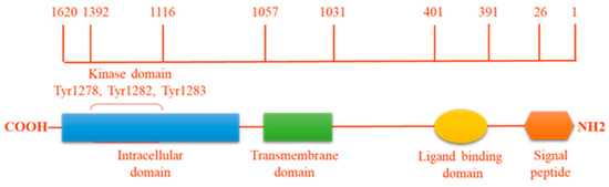 ALK protein structure. The intracellular tyrosine kinase domain harbors the 3 tyrosine motif Tyr1278, Tyr1282, Tyr1283, which represents the major auto-phosphorylation site regulating kinase activity.