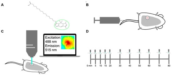 Due to their destructive nature, existing technologies that measure long-chain fatty acid uptake within tumor tissues are often limited in their ability to temporally study a single tumor [,]. Fluorescence imaging provides an opportunity to non-invasively study the dynamics of fatty acid metabolism over time, moving past the limitations of a static snapshot of fatty acid levels. To capture longitudinal fatty acid uptake and model a patient treatment cascade, we designed an imaging strategy using Bodipy FL c16. Bodipy FL c16, a commercially available fluorescent palmitate analog, consists of a 16-carbon long-chain fatty acid molecule linked to a Bodipy dye (Figure 1A). Bodipy FL c16 can be delivered systemically via tail vein injection (Figure 1B). Importantly, Bodipy FL c16 only enters cells via long-chain fatty acid transport proteins like normal fatty acids and not through simple cell membrane diffusion [], making Bodipy FL c16 fluorescence a reliable indicator of true fatty acid transport. Once the probe is taken up into the target cell, it accumulates in the cytoplasm, providing an indicator of how rapidly cells are importing fatty acids. Because the 16th carbon of the palmitate is fluorescently labeled, immediate degradation of the Bodipy dye during fatty acid oxidation (β-oxidation) is prevented.