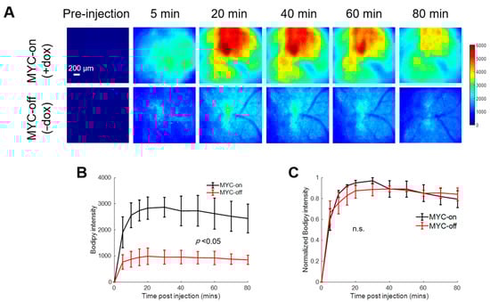 To illustrate that the delivery kinetics of Bodipy FL c16 were independent of Bodipy FL c16 uptake level, each mammary window’s kinetic curve in Figure 2B was normalized to its maximum fluorescence intensity. Normalizing each kinetic curve to its respective maximum fluorescence (Figure 2C) shows that, in both the MYC-on and MYC-off groups, Bodipy FL c16 accumulates into the window for approximately 30 min and remains stable for 30–80 min post-injection. We used the fluorescence at 60 min (Bodipy60), the mid-point in the plateau region, as a summary parameter to quantify Bodipy FL c16 fluorescence in subsequent experiments. Thus, MYC-dependent uptake of long-chain fatty acids can be visualized with Bodipy FL c16 in accordance with previously reported stable isotope uptake studies in this model [].