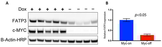Long-chain fatty acid (LCFA) uptake and trafficking within cells can be mediated by multiple receptors and carriers. Therefore, the increased Bodipy FL c16 uptake observed in MYC-on tumors may be mediated by multiple effector molecules. To evaluate which effector molecules are important for fatty acid uptake in MYC-driven tumors, we characterized the effect of MYC expression on cell surface transport proteins which have been reported to mediate LCFA uptake (Figure S2A). CD36 and the SLC27 gene family responsible for creating the fatty acid transport proteins (FATPs) have been shown to be critical in both the uptake and activation of long-chain fatty acids for fatty acid oxidation (β-oxidation) [,]. We analyzed RNA sequencing data of MTB-TOM tumors [] to investigate how regulating MYC expression affects CD36 and FATP-family expression. When MYC was turned off through dox withdrawal, at an RNA level, Slc27a3 was the mRNA sequence in the family that decreased in expression, though not significantly (Supplementary Figure S2A). However, MYC may indirectly regulate protein abundance by altering ribosome biogenesis and translation pathways [,,]. The mRNA Slc27a3 sequence specifically codes for FATP3; thus, we examined FATP3 protein expression in multiple MTB-TOM tumors. We found concomitant decreases in MYC and FATP3 protein expression when dox is removed during early tumor regression (Figure 3A; full blot, Supplementary Figure S2B). FATP3 protein expression was diminished by ~75% with the removal of dox (MYC-off) (Figure 3B; p < 0.05). While it is possible that multiple mechanisms contribute to increased Bodipy FL c16 uptake in MYC-on tumors, which are beyond the scope of the present study, we have identified at least one FATP-family member, FATP3, whose expression is correlated to MYC in a model of TNBC.