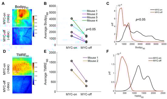 LCFAs serve as an important carbon source for oxidative phosphorylation after being broken down through β-oxidation in MYC-on tumors [,]; therefore, understanding how decreased availability of fatty acids through the reduction in MYC expression may affect oxidative phosphorylation would permit for dynamic in vivo assessment of tumor overall metabolic reprogramming. Previously, our group has established a method to optically measure oxidative phosphorylation in vivo in preclinical models via tetramethylrhodamine ethyl ester perchlorate (TMRE) []. This cationic molecule accumulates in proportion to the mitochondrial membrane potential [], which serves as a surrogate for oxidative phosphorylation rates (i.e., increased mitochondrial membrane potential correlates with increased levels of oxidative phosphorylation). Due to the unknown optical, biological, or chemical crosstalk between Bodipy FL c16 and TMRE probes, a separate cohort of mice was used to investigate TMRE uptake in MYC-on and MYC-off tumors. Specifically, 100 µL of 75 µM TMRE was injected via the tail vein and fluorescence images were captured from the mammary window over a span of 60 min according to our previously validated methods []. We observed TMRE60 (TMRE fluorescence 60 min post-injection) images for MYC-on and MYC-off breast tumors (Figure 4D). Roughly a 3-fold decrease in TMRE60 fluorescence was observed following four days of MYC downregulation (Figure 4E). Additionally, the distribution of TMRE60 fluorescence shifted left in MYC-off (−dox) tumors relative to MYC-on (+dox) tumors, as shown by the PDFs in Figure 4F, indicating a decrease in oxidative phosphorylation. Here, we demonstrate the dynamic assessment of both LCFA uptake and oxidative phosphorylation in MYC-driven breast tumor models during tumor growth and early regression.