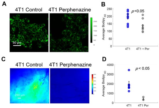 We first imaged Bodipy FL c16 uptake in vitro using a confocal microscope following a 2 h incubation with 80 µM perphenazine (Figure 5A) per standard protocols []. Bodipy FL c16 uptake was significantly decreased in 4T1 cells treated with perphenazine (Figure 5B) (p < 0.05). We also observed comparable results with two other cell lines from the same family (Figure S3). To monitor fatty acid uptake following perphenazine treatment in vivo, mammary window chambers were established, as previously described, over 4T1 tumors. On the day of imaging, the mammary window coverslip was removed and 80 µM perphenazine was topically applied to the exposed tissue for 2 h []. Following treatment, the window was rinsed with sterile phosphate-buffered saline (PBS), followed by our standard Bodipy FL c16 imaging protocol. Representative Bodipy60 images of a 4T1 tumor with and without perphenazine treatment are shown in Figure 5C. Short-term treatment with perphenazine significantly decreased Bodipy60 in 4T1 tumors (Figure 5D) (p < 0.05). We observed comparable results with in vivo non-tumorous mammary tissue treated with and without perphenazine (Figure S4).