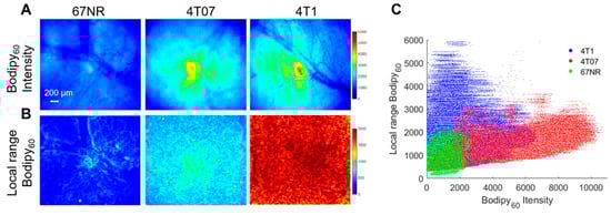 Both in vitro studies on cell monolayers and in vivo studies on mammary tumors in a window chamber model were performed here. Briefly, cell monolayers were incubated with 1 µM Bodipy FL c16 for 30 min prior to being washed and imaged immediately with a confocal microscope. Bodipy FL c16 uptake in 4T1 and 4T07 cell lines are significantly higher than that in the 67NR cell line (Figure S3). This trend is observed in vivo, as shown in Figure 6A. The 4T1, 4T07, and 67NR tumors were all grown to 5 × 5 mm in the mammary fat pad of female BALB/c mice, which maintain a fully intact immune system. Representative Bodipy60 images for each group are shown in Figure 6A. We also leveraged the spatial information within the images to investigate how tumor heterogeneity changes with metastatic potential. Local range images to represent heterogeneity, shown in Figure 6B, were created by calculating the local range (difference between maximum pixel intensity and minimum pixel intensity) for the nearest 1% of pixels for each respective pixel in an image.