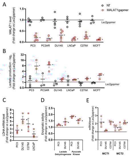 Effects of metastasis-associated lung adenocarcinoma transcript 1 (MALAT1) depletion in prostate cancer cells. (A) MALAT1 expression was quantified by qRT-PCR in five different prostate cancer (PC3 n = 6, PC3AR n = 3, DU145 n = 6, LNCaP n = 4, and C27IM n = 5) and one breast cancer (MCF7 n = 4) cell lines at 72 h after transfection with specific (MALAT1), control (LacZ), or no (NT) gapmers. (B) Lactate concentration determined by a colorimetric assay in the cell culture supernatant of PC3, PC3AR, DU145, LNCaP, C27IM, and MCF7 cells after MALAT1 gapmerization as in panel A (n = 3 or 4). Samples were collected after 48 h from transfection. (C,E) mRNA levels of lactate dehydrogenase A (LDHA, n = 3, C) and monocarboxylate transporter 1 and 2 (MCT1 and MCT2, n = 3, D) were quantified by qRT-PCR in PCa cells at 72 h after transfection with MALAT1 or LacZgapmers. (D) Enzymatic activity of lactate dehydrogenase and pyruvate kinase measured in PC3 (n = 3) cells 24 h after transfection with MALAT1 or LacZgapmers. Results are depicted as fold induction vs. LacZgapmer taken as 1 (black straight line). Individual values with mean +/−SEM are shown (red circles for MALAT1 gapmer, black circles for untreated cells, NT). Non-parametric paired two-tailed Student’s t-test determined statistical significance. * p ≤ 0.05 MALAT1gapmer vs. LacZgapmer.