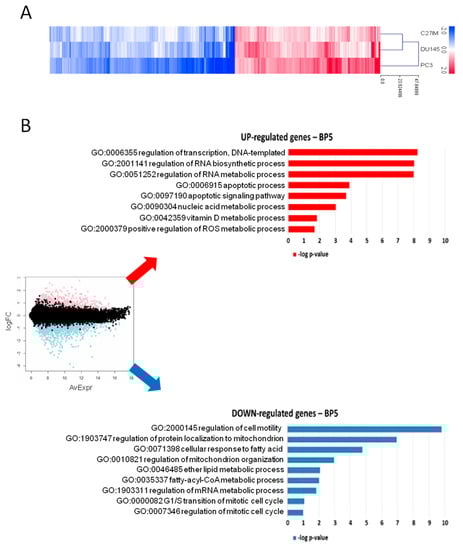 Gene profiling after MALAT1 silencing. (A) Heatmap of differentially regulated transcripts (log2 FC > 0.58, namely FC > 1.5; p < 0.01) in PC3, DU145, and C27IM cell lines transfected with MALAT1gapmer vs. LacZgapmer (2 biological replicates each, with dye-swap technical replicates). Cell line means log2 FC are represented with red stripes for upregulated genes (n = 1237) and blue for downregulated genes (n = 1574), as listed in Table S2. (B) MA plot with differentially regulated genes highlighted in red and blue (left), and most representative categories of overrepresented biological processes in overexpressed genes (red histograms) and underexpressed genes (blue histograms), according to gene ontology enrichment analysis (right). Histogram length is proportional to the statistical significance of the enrichment (−log10 of enrichment p-value).