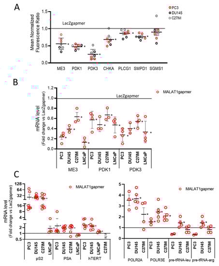 Validation of array data in PCa cells by qRT-PCR. (A) Differential expression of genes as emerging from transcriptomic analysis before/after MALAT1 depletion in C27IM, DU145, and PC3 cells. Transcript levels of ME3, PDK3, PDK1, and PCho-related genes (choline kinase A (CHKA), Phospholipase C Gamma 1 (PLGC1), sphingomyelin phosphodiesterase 1 (SMPD1), and sphingomyelin synthase 1 (SGMS1)) are expressed as fold change vs. LacZgapmer (mean ± SEM are showed). (B,C) mRNA expression level of those genes emerging as differentially modulated were validated in different PCa cells (PC3, DU145, C27IM, and LNCaP) transfected with specific gapmer for MALAT1 or LacZ. Results are plotted as fold induction vs. LacZgapmer (placed to 1 and depicted as a black line). Individual values (n = 3–8) with mean ± SEM are showed. Non-parametric paired two-tailed Student’s t-test determined statistical significance. * p ≤ 0.05 MALAT1gapmer vs. LacZgapmer. * p < 0.05 vs. gapmerLacZ.