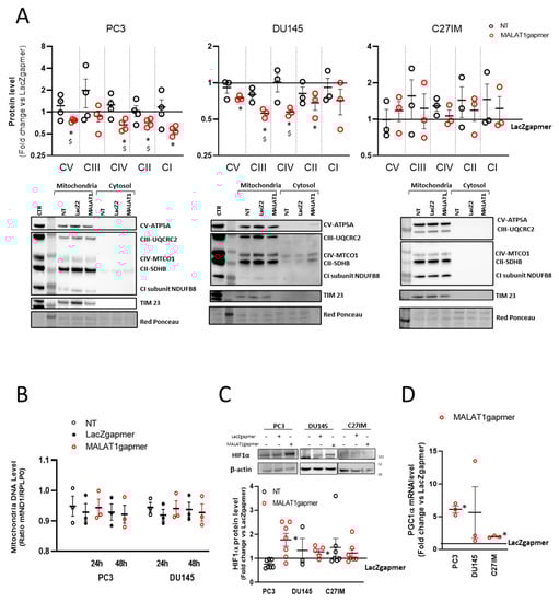 Metabolic alteration after MALAT1 depletion. (A) Western blotting analysis of OXPHOS complex subunit expression determined by using total OXPHOS antibody cocktail in PC3 (left), DU145 (middle), and C27IM (right) cells’ mitochondrial fractions upon MALAT1 depletion. Upper panels: Densitometric analysis plotted as fold change vs. LacZgapmer after normalization to loading control red ponceau. Lower panel: Representative western blotting experiments. Uncropped Western Blots of Figure 4A are available in Figure S9 (B) qRT quantification of mitochondrial DNA level in PC3 and DU145 cells at 24 h or 48 h after transfection with specific (MALAT1), control (LacZ), or no (NT) gapmer. Data are expressed as ratio mtND1 vs. RPLP0 level. (C) Representative western blot and densitometry analysis for HIF1α assessed in 3 different PCa cells (PC3, DU145, and C27IM) not transfected or transfected with MALAT1 or LacZgapmers. β-actin was used as a loading control. Uncropped Western Blots of Figure 4C are available in Figure S10 (D) qRT expression of PGC1alpha mRNA in different PCa cells (PC3, DU145, and C27IM) interfered with MALAT1 or LacZgapmers. Results are plotted as fold induction vs. LacZgapmer taken as reference value 1 (straight black line). Individual values (n = 3–8) with mean ± SEM are shown. Non-parametric paired two-tailed Student’s t-test determined statistical significance. * p ≤ 0.05 MALAT1gapmer vs. LacZgapmer. $ p ≤ 0.05 MALAT1gapmer vs. NT.