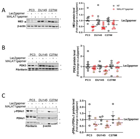 Validation of PCa cells array data set. (A–C) Representative western blot and densitometry analysis for specific metabolic enzymes assessed in 3 different PCa cells (PC3, DU145, and C27IM) not transfected or transfected with specific gapmers for MALAT1 or LacZ: ME3 ((A), black arrow indicates specific signal), PDK3 (B), γ-PDHα1, and total PDHα1 (C). β-actin or fibrillarin were used as a loading control. ME3 and PDK3 protein levels were normalized versus β-actin and fibrillarin, respectively; γ-PDHα1 versus total PDHα1. Results are plotted as fold change vs. LacZgapmer taken as reference value 1 (straight black line). Individual values (n = 4 to 8) with mean ± SEM are shown. Non-parametric paired two-tailed Student’s t-test determined statistical significance. * p ≤ 0.05 MALAT1gapmer vs. LacZgapmer. Uncropped Western Blots of Figure 5 are available in Figures S11–S13.