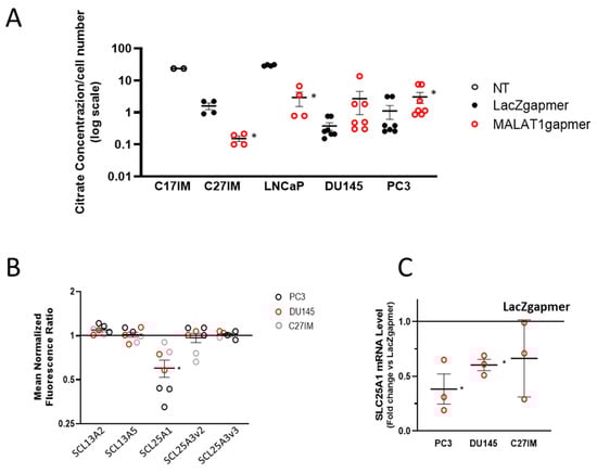 Given the relevance of citrate metabolism in the homeostasis of prostate epithelial cells, we also measured citrate production in the extracellular medium of PC3, DU145, LNCaP, C27IM, and C17IM cells (Figure 6A) before/after MALAT1 targeting. As expected, basal citrate levels were elevated in the C17IM cell line, established from a benign prostate hyperplasia BPH lesion [31]. Interestingly, citrate production was detectable in C27IM and LNCaP in the basal condition and significantly decreased after MALAT1 targeting. In contrast, in metastatic PC3 and DU145 cells exhibiting low basal levels of citrate in the extracellular medium, citrate secretion was significantly recovered or showed a trend towards increasing, respectively. In parallel, we checked the expression of solute carrier transporters present in the agilent platform (Figure 6B), and, in all prostate cancer cell lines analyzed upon MALAT1 depletion, we found a statistically significant downmodulation exclusively of SLC25A1, a mitochondrial citrate transporter mediating the exchange of mitochondrial citrate with cytosolic malate [32,33,34]. Downmodulation of SLC25A1 was confirmed by qPCR in PC3 and DU145 cells (Figure 6C).