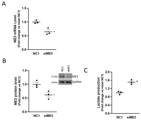The malic enzyme catalyzes the oxidative decarboxylation of malate to pyruvate using either NAD+ or NADP+ as a cofactor. Mammalian tissues contain three distinct isoforms of malic enzyme: A cytosolic NADP(+)-dependent isoform, a mitochondrial NADP(+)-dependent isoform, and a mitochondrial NAD(+)-dependent isoform. The ME3 gene encodes a mitochondrial NADP(+)-dependent isoform, which catalyzes the decarboxylation of malate to pyruvate, contributing indirectly to the TCA cycle via the malate/pyruvate cycle [35]. Its role in cancer, however, is not fully understood. In pancreatic cancer, ME3 promotes proliferation, epithelial to mesenchymal transition, and aggressiveness [36]. To assign a role to ME3 in the metabolic perturbation mediated by MALAT1, we interfered with ME3 by siRNA in PC3 cells obtaining a 50% protein reduction (Figure 7A,B) and evaluated the consequences of ME3 silencing in terms of lactate production (Figure 7C). Of interest, we appreciated a modest but reproducible increase in lactate accumulation (~1.5 fold over control), partially mimicking the effect observed upon MALAT1 targeting. This finding revealed an unprecedented functional relationship between MALAT1 and the ME3 that might represent a crucial transitional element between oxidative phosphorylation and glycolysis toward the Warburg effect.