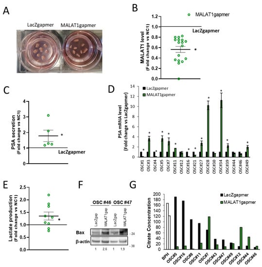 Organotypic slice cultures of prostate tumors and in vivo effects of MALAT1 depletion. (A) Image of representative human PCa organotypic slice cultures (OSCs) obtained from intra-operatory prostate cancer specimens transfected with specific (MALAT1) or control (LacZ) gapmer. (B) MALAT1 expression level was quantified by qRT-PCR in OSCs (n = 17) at 72 h after transfection with specific MALAT1gapmer or LacZgapmer. (C) PSA concentration measured in the extracellular medium of OSCs (n = 5) at 24h after transfection with MALAT1gapmer or LacZgapmer. (D) PSA mRNAs in 17 OSCs as in (B,E). Lactate concentrations analysis assessed using a colorimetric assay in the supernatant of OSCs (n = 9) at 24 h after transfection with MALAT1 silencing. Results are plotted as fold change vs. LacZgapmer (placed to 1 and depicted as a black line). Individual values (n = 3) with mean ± SEM are showed (green circles for MALAT1 gapmer). Non-parametric paired two-tailed Student’s t-test determined statistical significance. * p ≤ 0.05 MALAT1gapmer vs. LacZgapmer. (F) Representative western blot of BCL2 Associated X (BAX) after MALAT1 silencing in OSCs β-actin was used as a loading control. Numbers represent the fold induction vs. LacZgapmer normalized to loading control. A molecular weight marker is indicated. Uncropped Western Blots of Figure 8F are available in Figure S15 (G) Citrate concentrations analysis by colorimetric assay in the cell culture supernatant of normal/benign hyperplastic prostate (BPH) and in several PCa-derived OSC before and after MALAT1gapmer collected after 48 h of interference. Citrate concentration was normalized to relative βactin level. OSC #5, #16, #11, #7, #49, #12, #44, #46 exhibited an efficient MALAT1 depletion. Results are plotted mean ± SEM.