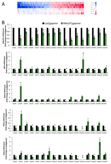 Validation of ME3, PDK3, PDK1, and CHKA repressed after MALAT1 depletion was performed in 17 OSCs by qPCR (Figure 9B). These genes were repressed in 9/17 (ME3), 6/17 (PDK3), 9/16 (PDK1), and 9/16 (CHKA) OSCs. Of note, OSC#3 and OSC#34 exhibited upregulation of ME3, PDK3, and PDK1, while OSC#46 of CHKA, despite a significant MALAT1 targeting. This phenomenon might reflect the complex heterogeneity of the OSCs’ microenvironment or differences between individual patients. Variation in the expression between different OSCs of MALAT1, ME3, PDK3, PDK1, and CHKA is shown in Figure S8B–F.