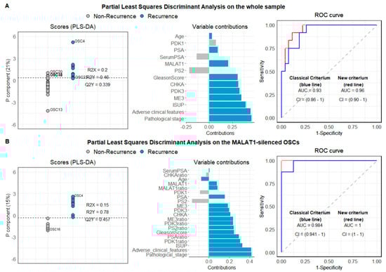 Partial least squares discriminant analysis (PLS-DA) on PCa-derived OSCs. PLS-DA was conducted on the whole sample (A) and MALAT1-silenced OSCs (B). The left panel reports the scores from the single component PLS-DA model. The separation threshold (dashed line) derives from the Youden criteria. The middle panel reports the variable loadings on the model component. Colors indicate the class (non-recurrent vs. recurrent patients) for which each variable assumes the maximal mean value. The right panel reports the ROC curves derived from the PLS-DA models for both the model, including the gene expression (new criterium) and the model including only the variables collected in the standard clinical practice (classical criterium).