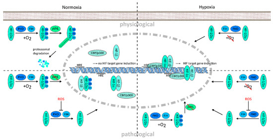 Figure 1. Oxygen dependent hypoxia-inducible factor (HIF) regulation and deregulation of HIF in tumor environment. Normoxic oxygen conditions lead to proteasomal degradation of the hypoxia-inducible factor (HIF) protein and prevent target gene transcription (upper left); Decreased oxygen availability deactivates the hydroxylation of the HIF protein by cofactors, factor-inhibiting HIF (FIH) and prolyl hydroxylases (PHD), which enables HIF protein accumulation and translocation into the nucleus. HIF-α and -β subunits dimerize and form a transcription complex with the cofactors CBP/p300. Complex binding to the hypoxia responsive elements (HRE) on the promoter region of HIF target genes leads to their transcription (upper right); Under pathological conditions, hypoxia can be accompanied by increased reactive oxygen species (ROS) and impaired von Hippel–Lindau protein (pVHL) function, promoting HIF induction to an excessive extent, e.g., driving tumorigenesis under normoxic, as well as hypoxic condition (lower left and right). OH, hydroxylation; Ub, ubiquitination.