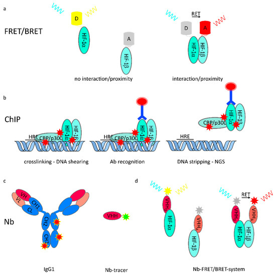 Figure 3. Methods to unravel effects on HIF protein stability, interaction, and function in vitro and in vivo. (a) Interaction of protein (complexes) is detectable by proximity-depended resonance energy transfer such as fluorescence resonance energy transfer (FRET) or bioluminescence resonance energy transfer (BRET). Protein localization and proximity are directly imaged in vitro or in vivo and recorded with high spatiotemporal resolution; (b) Transcriptional activity of transcription factor is assessed by chromatin immunoprecipitation (ChIP). Precise antibody recognition and accuracy is mandatory for qualitative evaluation of changes upon any perturbation; (c) Nanobodies (Nb), shown in relation to conventionally used IgG1, can be functionalized and used as intravital tracers. Due to their small size, penetration depth of cells and tissue is superior. Stoichiometric labeling of Nb enables quantitative imaging; (d) Nb tracer addressing interaction partners allow in vivo FRET/BRET independent of genetic manipulation, giving rise to a multitude of new life cell/intravital interaction studies.