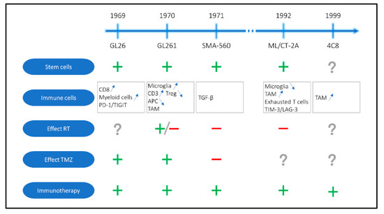 Schematic and chronological presentation of the old preclinical immunocompetent mouse models for glioblastoma with information about stemness, immune cell composition, the effects of standard of care and the efficiency of immunotherapy. RT: radiotherapy, TMZ: Temozolomide, PD-1: programmed cell death protein 1, TIGIT: T cell immunoglobulin and ITIM domain, Treg: regulatory T cell, TAM: tumor associated macrophage, TGF-β: transforming growth factor β, TIM-3: T cell immunoglobulin and mucin-domain containing 3, LAG-3: lymphocyte activation gene 3, (+) presence of stem cell populations and/or positive effect of treatment administration, (-) no effect of treatment administration and (?) data not available in literature.