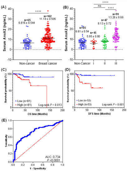 2.2. Serum AnxA2 Levels in Breast Cancer Patients