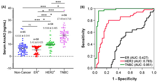 2.5. Serum AnxA2 Has Good Diagnostic Value for Triple-Negative Subtype of Breast Cancer