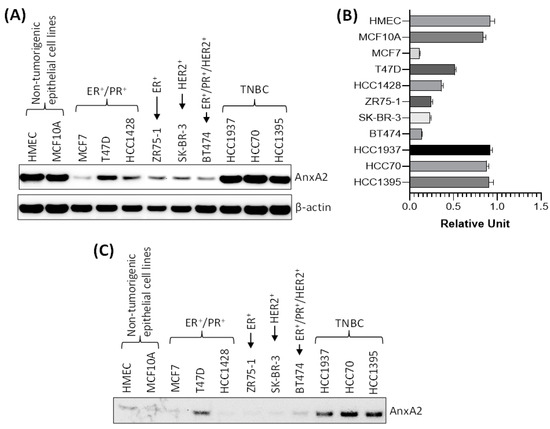 To further confirm that the high expression of AnxA2 found in tumor tissues and serum samples of TNBC patients are consistent with the breast cancer cell lines, we checked the expression and secretion of AnxA2 in non-tumorigenic mammary epithelial cell lines and in different subtypes of breast cancer cell lines. As shown in Figure 4A,B, the immunoblotting data clearly suggest that the expression of AnxA2 is high in TNBC cell lines (HCC1937, HCC70, and HCC1395 cells) compared to ER+ (ZR75-1 cells), ER+/PR+ (MCF7, T47D, and HCC1428 cells), HER2+ (SK-BR-3 cells), and ER+/PR+/HER2+ (BT474 cells) breast cancer cell lines. However, the expression of AnxA2 in TNBC cell lines are comparable to the non-tumorigenic mammary epithelial cell lines (HMEC, and MCF10A cells; Figure 4A,B). In another experiments, we compared the secretion of AnxA2 in breast cancer cell lines with normal mammary epithelial cells. The equal number of cells were seeded and grown in their respective medium for overnight and then switched to serum free medium. After 24 h, the AnxA2 was immunoprecipitated from culture medium using anti-AnxA2 antibody and expression of AnxA2 secretion was analyzed by immunoblot analysis. Our results suggest that the secretion of AnxA2 is high in TNBC cell lines compared to non-tumorigenic, ER+, PR+, and/or HER2+ breast cancer cell lines (Figure 4C). The results of the high secretion of AnxA2 from TNBC cell lines were further confirmed the conclusion derived from the serum samples of the breast cancer patients in this study, which suggest that high secretion of AnxA2 is specifically associated with the triple-negative subtypes of breast cancer patients.