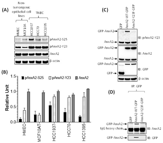 Our previous results showed that the secretion of AnxA2 is high in TNBC cell lines compared to non-tumorigenic mammary epithelial cell lines. However, the expression of endogenous AnxA2 is same in both cell types. Therefore, we next asked whether the phosphorylation status of AnxA2 an important event in the secretion process of AnxA2 from TNBC cell lines is. Because AnxA2 possesses two potential phosphorylation sites, Tyr23 and Ser25 at its N terminus, therefore, we checked the phosphorylation of these two sites in both non-tumorigenic mammary epithelial cell lines and TNBC cell lines using immunoblot analysis. The results presented in Figure 5A,B showed that the phosphorylation of AnxA2 at Tyr23 (pAnxA2-Y23) is very high in all TNBC cell lines (HCC1937, HCC70, and HCC1395 cells) compared to non-tumorigenic cell lines (HMEC, and MCF10A cells). The phosphorylation of AnxA2 at Ser25 (pAnxA2-S25) were only observed in HCC1937 TNBC cells whereas the other TNBC cell lines and non-tumorigenic cell lines were showing very minimal phosphorylation of AnxA2 at Ser25. However, the expression of AnxA2 is equal in both non-tumorigenic and TNBC cell lines (Figure 5A,B). To further check whether the phosphorylation of AnxA2 at Tyr23 is association with the secretion of AnxA2 from cells, we overexpressed wild-type AnxA2 tagged with GFP (AnxA2-WT-GFP), non-phosphomimetic mutant of AnxA2 tagged with GFP (AnxA2-Y23F-GFP), or GFP alone in HCC1395 cell line (Figure 5C). Immunoblot analysis showed that similar to endogenous AnxA2 phosphorylation at Tyr23 in HCC1395 cells, the overexpression of GFP tagged wild-type AnxA2 is also phosphorylated at Tyr23. In the case of the non-phosphomimetic Tyr23 mutant AnxA2-Y23F-GFP (Figure 5C), we could not detect any phosphorylation at Tyr23 in HCC1395 cells. To further check the role of Tyr23 phosphorylation in AnxA2 secretion, the conditioned media of HCC1395 cells transfected with AnxA2-GFP fusion construct were immunoprecipitated with anti-GFP antibody. On immunoblotting with anti-AnxA2 antibody, the secretion of GFP-AnxA2 were only observed in cells overexpressing AnxA2-WT-GFP while no GFP-AnxA2 expression were detected in cells overexpressing AnxA2-Y23F-GFP, indicating that phosphorylation of Tyr23 site is required for the secretion of AnxA2 (Figure 5D). To further determine whether high expression of AnxA2 detected in serum samples of TNBC patients is linked with the phosphorylation of AnxA2 at Tyr23 present in tumor tissues of TNBC patients, the expression of pAnxA2-Y23 were analyzed in tumor tissues of TNBC patients and matched adjacent non-tumorigenic breast tissues by immunoblot analysis. Compared with the non-tumorous corresponding tissues, the phosphorylation of AnxA2 at Tyr23 and total AnxA2 were observed in 90.0% (9/10) and 80.0% (8/10) of TNBC tumor tissue samples, respectively (Figure 6A,B). Together, these results suggest that high expression of AnxA2 found in serum samples of TNBC patients is associated with the high expression and phosphorylation of AnxA2 at Tyr23 in tumor tissues of TNBC patients.