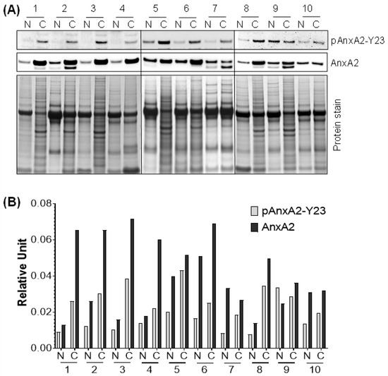 Expression of pAnxA2-Tyr23 and AnxA2 in tumor tissues of TNBC patients and matched adjacent non-tumorigenic breast tissues. (A) Immunoblot analysis of pAnxA2-Y23 and AnxA2 in tumor tissues of TNBC patients (C) and matching adjacent non-tumorous (N) breast tissues. Coomassie staining was used as a loading control. (B) Bar chart showing the densitometric analysis of pAnxA2-Y23 and AnxA2 bands of the immunoblot of panel A. Intensity of pAnxA2-Tyr23 and AnxA2 bands were normalized by total protein loading control. Uncropped Western Blots of (A)are available in Figure S4.