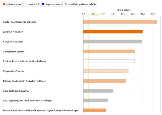 Top 10 canonical pathways enriched in progressed vulvar squamous cell carcinoma (progVSCC) compared to disease-free vulvar squamous cell carcinoma (d-fVSCC) tumors, identified by core analysis in Ingenuity Pathway Analysis (IPA). Top 10 canonical pathways enriched by IPA. The vertical orange line represents the threshold p-value (0.05) for pathway’s enrichment. The horizontal axis is the –log (p-value). Pathways predicted to be activated are in orange (based on the Z-scores, the activation scores determined by IPA), and grey bars relate to pathways with no activity pattern available.