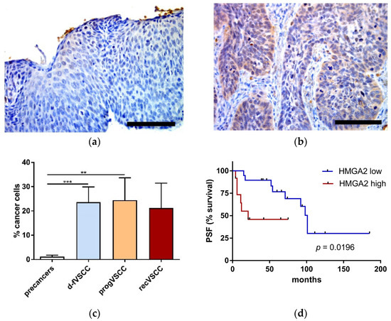 The percentage of HMGA2-positive neoplastic cells. Examples of immunohistochemical HMGA2 staining performed on tissue sections of high-grade squamous intraepithelial lesions (HSIL) (a) and progVSCC (b) tumor samples. Images were taken at 40× magnification. Scale bar, 100 μm. Comparison of the IHC results for premalignant lesions (HSIL; n = 44 and dVIN; n = 6), d-fVSCC (n = 19), progVSCC (n = 13) and recVSCC (n = 7) samples (c). Survival curve (time to progression) according to the relative numbers of HMGA2-positive cancer cells in primary VSCC tumors (n = 31) (d). Significant alternations are indicated by asterisks (**, p-value ≤ 0.01; ***, p-value ≤ 0.001). Abbreviations: PFS, progression-free survival; high and low, high and low proportion of HMGA2-positive cancer cells (≥30 and ≤10 cells, respectively).