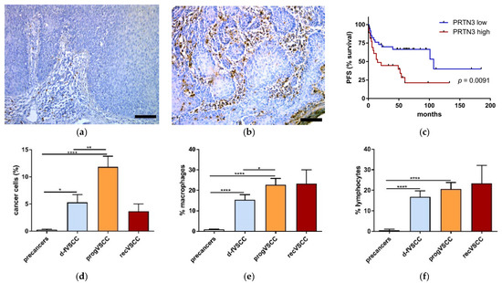 PRTN3 staining was cytoplasmic and observed in neoplastic cells, macrophages, and lymphocytes (Figure 3). In general, the observed percentage of PRTN3-positive cells was lower among cancer cells than among the infiltrating non-neoplastic cells. Significantly higher relative numbers of PRTN3-positve cells were seen in VSCC than in vulvar premalignant lesions (dVIN and HSIL) (Figure 3d–f). Survival curves of the two groups of patients with primary VSCC tumors categorized by the number of PRTN3-positive cancer cells are shown in Figure 3c. Patients with higher numbers of PRTN3-positive cancer cells in the tumors had a significantly shorter time to progression than those with low numbers of these cells. The impact of PRTN3-positive macrophage or lymphocyte counts on survival was statistically insignificant.