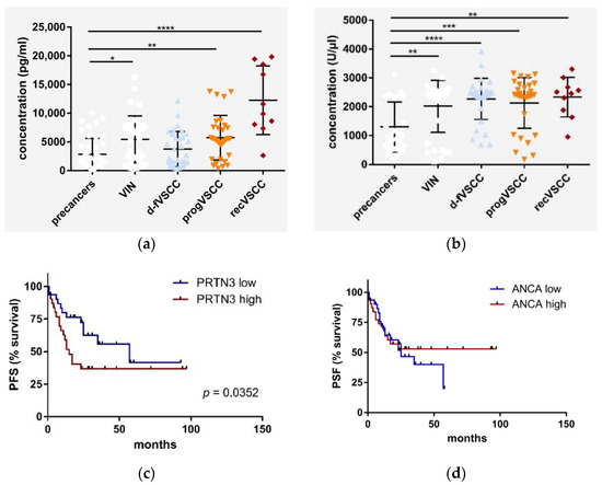 PRTN3 (a) and ANCA (b) serum levels. The results for the sera of 37 patients with vulvar pre-cancers (HSIL, n = 27; dVIN, n = 7), patients with primary (n = 64) and recurrent VSCC (n = 10) were compared to the control sera obtained from healthy women ((c), n = 44). Survival curves (time to progression) according to the serum levels of (c) PRTN3 and ANCA in patients with primary VSCC ((d), n = 64). Significant alternations are indicated by asterisks (*, p-value ≤ 0.05; **, p-value ≤ 0.01; ***, p-value ≤ 0.001; ****, p-value ≤ 0.0001). Abbreviations: PFS, progression-free survival; high, high protein level, i.e., above the cut-off value; low-protein level, i.e., below the cut-off value (i.e., the median of protein concentration).
