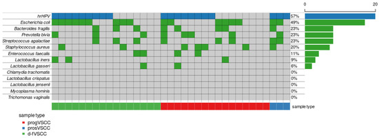 Distribution of bacterial species detected in VSCC samples. Each column corresponds to the individual tumor case (d-fVSCC, n = 16; progVSCC, n = 16 and prosVSCC, n = 3). Each row corresponds to an individual microorganism with its presence or absence depicted in green or grey, respectively. The results of genotyping of 13 vaginal microorganisms is related to hrHPV status of a given tumor with the virus presence or absence depicted in blue or grey, respectively. The values on the x-axis describe the number (0–20) and a percentage of the samples with the presence of a given microorganism.