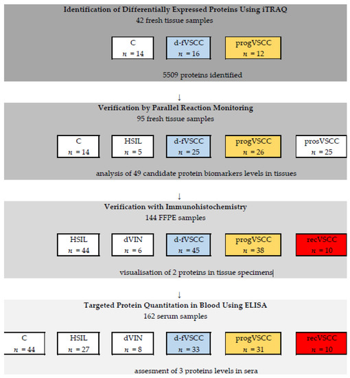 The numbers of samples, according to the stages of the study, are provided in Figure 6. Primary VSCC tumors samples were divided into two categories depending of the subsequent disease course. The first comprised tumors samples of patients that were found disease-free during the follow-up period (“d-fVSCC”) and the second—tumors samples obtained from patients who progressed (“progVSCC”). The progression was defined as local recurrence, regional LN recurrence, or cancer-related death. In addition, tumor samples obtained during vulvectomies of patients with primary VSCC enrolled prospectively (prosVSCC) and of patients with local VSCC recurrence (recVSCC) were included at the successive stages of the study. Finally, plasma samples were used for targeted protein quantitation in the blood of patients with vulvar premalignant lesions and VSCC. Normal vulvar tissue samples and sera of healthy female volunteers served as the control samples (C).