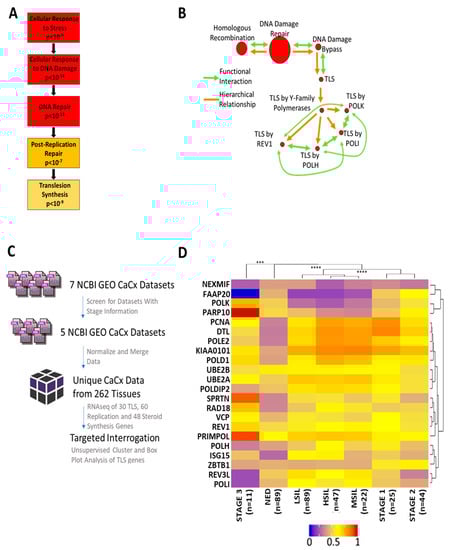 NCBI GEO CaCx data sets that included transcriptomic and stage information were identified. Gene expression was normalized using feature scaling to allow inter-data set comparison. The Kyoto Encyclopedia of Genes and Genomes (KEGG) and AmiGO were used to identify gene subsets specific to the following pathways: Replication, TLS, Steroid synthesis [Replication KEGG Pathway: ko03030 [57]; TLS GO-Term: GO:0019985 [58]; Steroid KEGG Pathway: map00140 [59]]. The TLS heatmap and boxplots of individual gene expression by cancer stage were created with the ggplot2 package in the statistical analysis software R and p-values were calculated using students t-test. Fold-change and p-value data available for GEO data set GSE6791 was rank ordered using an established approach for gene ontology analysis [60] that was conducted using both the GOrilla online tool as well as Gene Set Enrichment Analysis software [61,62,63,64]. A threshold of p < 10−5 was chosen for all gene onthology analyses.