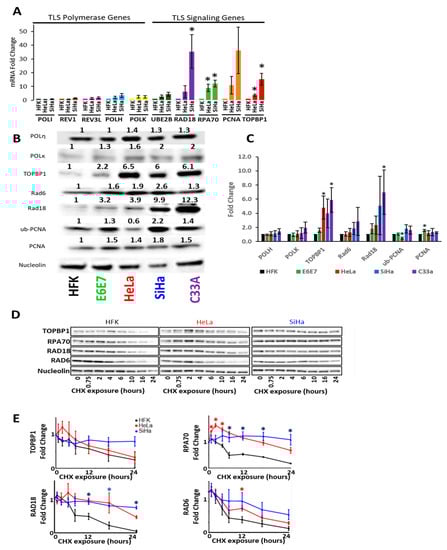 Then, in vitro and ex vivo systems were used to validate the in silico data. First, TLS gene expression and protein abundance were defined with in vitro models of CaCx. HPV infects keratinocytes, promoting their transformation into CaCx. Primary keratinocyte cell lines can be made from human foreskins and are a commonly used to investigate CaCx and HPV biology. Unmodified HFKs represented untransformed keratinocytes and two CaCx cell lines (SiHa and Hela) represented CaCx. These two CaCx cell lines were chosen because they were derived from cancers caused by the two most common oncogenic HPVs (HPV18 and HPV16). HeLa cells express HPV18 oncogenes, while SiHa cells express HPV16 oncogenes. RT-PCR analysis defined expression of TLS polymerase genes and a representative panel of other TLS genes. This work demonstrated minimal differences in TLS polymerase expression among these three cell lines (Figure 2A). However, the expression of other TLS genes was increased between 2- and 30-fold in a comparison of primary HFKs to the cervical cancer cell lines HeLa and SiHa (Figure 2A). The expression of two genes involved with the activation of TLS (RPA70 and TOPBP1) was also increased [30,31]. Following mentions of Rad6 refer to the protein corresponding to the UBE2B transcript.