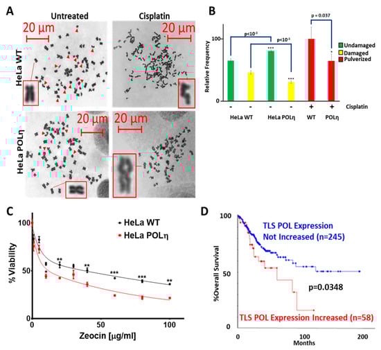 Exogenous POLη Promotes Genome Stability in HeLa S3 Cells. (A). Representative images of metaphase spreads. Inserts show magnified images of indicated chromosomes. (B) Bar graphs show percentage of undamaged (green), damaged (yellow), and pulverized chromosomes in Hela S3 WT and HeLa S3 POLη cells. 4063 chromosomes were counted from 85 cells over three independent experiments. (C) Zeocin sensitivity of HeLa S3 WT (black) and HeLa S3 POLη (red), n = 3. All data are mean ± SEM. p-Value annotation: * < 0.05, ** <0.01, *** < 0.001, student’s t-test. (D) Kaplan–Meier (KM) curve of TCGA CaCx survival in individuals over-expressing (red) TLS Polymerases vs. unaltered/decreased TLS polymerase expression (blue). The number of women in each group is shown in parentheses. p-Value was obtained via log-rank test.