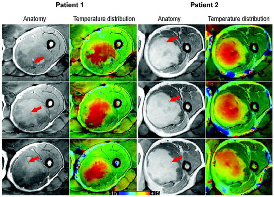 - Gellermann, J.; Hildebrandt, B.; Issels, R.; Ganter, H.; Wlodarczyk, W.; Budach, V.; Felix, R.; Tunn, P.-U.; Reichardt, P.; Wust, P. Noninvasive magnetic resonance thermography of soft tissue sarcomas during regional hyperthermia: Correlation with response and direct thermometry. Cancer 2006, 107, 1373–1382. [Google Scholar] [CrossRef] [PubMed]