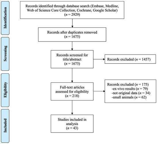 The resulting 218 relevant papers were then assessed for eligibility, using the following exclusion criteria: (#1) ex-vivo results, (#2) not original data, and (#3) small animals. Ex vivo results excluded studies on simulation or phantoms, which we considered too far from the final intended use of the clinic to be included in this review. No original data excluded reviews and studies using already published data as reference. Small animals were considered to be anything smaller than a dog. These studies were excluded because we deem these data not predictive for humans due to the different motion profile (e.g., faster heart rate) and their smaller size. Additionally, the equipment used is specially made and non-clinical, lowering the ease of translation into the clinic. Large animal studies without heating were also not included. After this eligibility assessment, 43 papers remain to be included in the systematic analysis. A PRISMA flow chart of the exclusion process is shown in Figure 2.