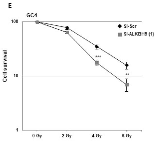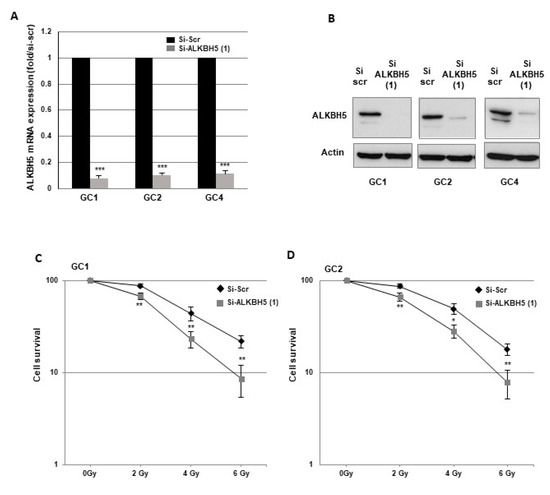 To determine the role of ALKBH5 in radioresistance, we used GBMSCs derived from three human GBM biopsy specimens (GC1, GC2, GC4) cultured as primary neurospheres, and previously characterized [27,28,29,30]. First, we showed that specific ALKBH5 siRNA significantly inhibited mRNA expression compared to a scramble control in the three neurosphere cell lines (Figure 1A). Inhibition was also confirmed at the protein level by Western blot analysis (Figure 1B).