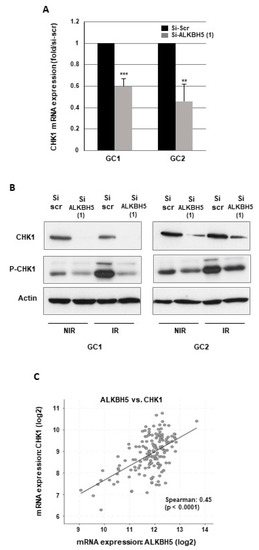 Similar results were obtained with a second ALKBH5 siRNA (Figure S1E). A high inhibition of CHK1, when ALKBH5 is downregulated, was also confirmed at the protein level by Western blot analysis (Figure 2B). In addition, we observed, in response to IR, an increase in CHK1 phosphorylation that was inhibited by ALKBH5 siRNA (Figure 2B), indicating that the activation of CHK1 following IR-induced DNA damage can be overcome by blocking the m6A RNA demethylase. In contrast, blocking ALKBH5 did not affect the expression of CHK2, ATR, or ATM. Since the results in GBMSCs showed that ALKBH5 could regulate CHK1 expression, we then analyzed the correlation between ALKBH5 and CHK1 expression using the glioblastoma database of the Cancer Genome Atlas (TCGA). As shown in Figure 2C, a significant positive correlation was observed between the expression of the two genes.