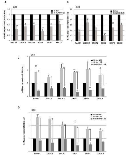 Cells use two main pathways to repair double-strand breaks (DSBs), homologous recombination repair (HRR) and nonhomologous end joining (NHEJ). We next examined the role of ALKBH5 in the expression of key DNA damage repair players involved in these two pathways. First, we observed in the primary cell lines transfected with specific ALKBH5 siRNA compared to a scramble control a significantly reduced expression of several genes involved in HRR. In particular, Rad51, XRCC2, BRCA2, EXO1, and BRIP1 were downregulated (Figure 3A,B). Similar results were obtained on Rad51 expression with a second ALKBH5 siRNA (Figure S1E). We next analyzed the effect of IR on the expression of these HRR target genes in GBMSCs. As shown in Figure 3C,D, IR significantly increased Rad51, XRCC2, BRCA2, EXO1, and BRIP1 mRNA levels, whereas the induction by radiations was abrogated when ALKBH5 was inhibited by specific siRNA, indicating that blocking this m6A RNA demethylase was able to overcome the upregulation of DDR genes induced by IR. In contrast, the expression of the key genes involved in NHEJ, including Ku70, Ku80, and DNA-PKs, was not affected by ALKBH5 knockdown (data not shown).