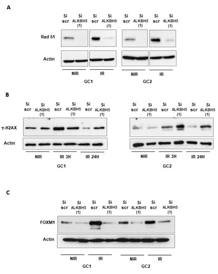 The recombinase Rad51 is the central protein involved in the homologous recombination of DNA during double-strand break repair [35]. Previous reports have confirmed a high expression of Rad51 in GBMSCs and its important role in resistance to radiotherapy [4,33,36,37]. As mentioned above, Rad51 mRNA expression can be regulated by ALKBH5. We then evaluated Rad51 levels by Western blot in GBMSCs following ALKBH5 knockdown. We observed that IR induced an upregulation of Rad51 protein levels, which was attenuated by ALKBH5 inhibition (Figure 4A). Phosphorylation of the Ser-139 residue of the histone H2AX (γ-H2AX) is an early cellular response to DSBs and its quantification is a very sensitive method of detecting DSBs [38]. To confirm that ALKBH5 could affect the repair of IR-induced DSBs, we examined the expression levels of the DSBs marker γ-H2AX by Western blot analysis. As expected, γ-H2AX increased rapidly following IR (3 h) and returned to basal levels at 24 h in control cells, indicating an efficient DDR process in GBMSC neurospheres (Figure 4B). However, in cells transfected with an ALKBH5 siRNA, the DNA damages persisted significantly 24 h post-IR (Figure 4B), indicating that blocking ALKBH5 can delay DDR, improving the radiotherapy efficacy. The transcriptional factor FOXM1 is known to play an essential role in cell cycle, proliferation, DNA replication, and stem cell maintenance [39]. We have recently shown that FOXM1 is a key regulator of GBMSC radioresistance [27]. In addition, Zhang et al. reported the regulation of FOXM1 expression by ALKBH5 [14]. We therefore examined whether the activation of FOXM1 following IR could be regulated by ALKBH5. As shown in Figure 4C, we observed that IR induced an upregulation of FOXM1 protein levels, which was attenuated by ALKBH5 inhibition.
