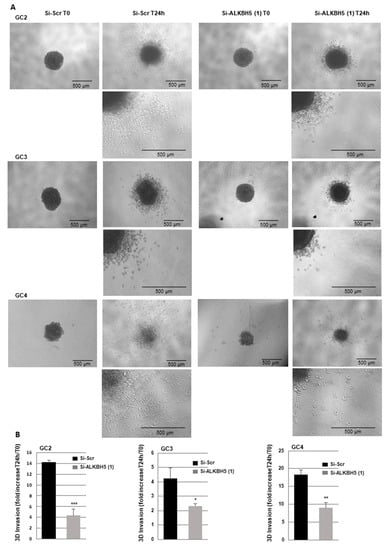 The role of ALKBH5 in tumor cell invasion remains unclear. To investigate if ALKBH5 could be involved in this process in GBMSCs, we performed 3-D invasion assays in Matrigel, as described in the methods, using invasive primary neurospheres from three different patients in which ALKBH5 was knocked down with a specific siRNA. As shown in Figure 5, all GBMSC spheroids deficient for ALKBH5 exhibited a significant reduced invasion capability relative to control spheroids.