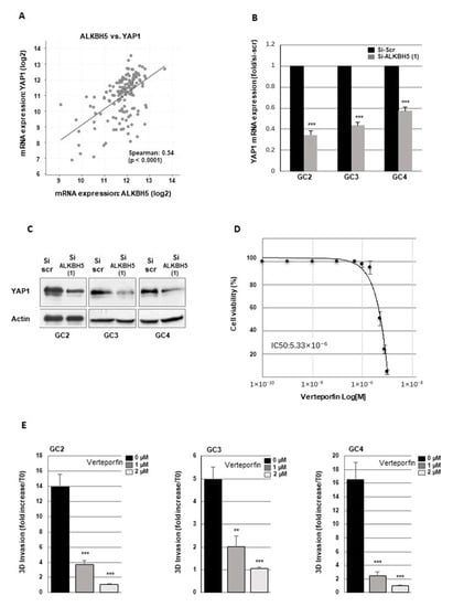 ALKBH5 regulates GBM cells invasion through YAP1 expression. (A) The correlations between ALKBH5 expression and YAP1 were obtained by the co-expression analysis in cBioPortal (https://www.cbioportal.org) using the TCGA database. Values correspond to Spearman’s rank correlation coefficient and its associated p-value p < 0.001. (B,C) YAP1 expression was analyzed by (B) real time PCR or (C) western blot in primary neurospheres from 3 different patients (GC2, GC3, GC4) expressing a specific siRNA (si-ALKBH5 (1)) or a scramble control (si-Scr). (D) Dose-response curve of verteporfin on cell viability of GC2. (E) Quantification of 3-D invasion performed with Image J software from micrographs of Matrigel-embedded GBM spheroids. Three independent experiments and presented as means ±SD. *** p < 0.001 ** 0.001 < p < 0.01. Original Western blot gels for (C) available in Figure S6.