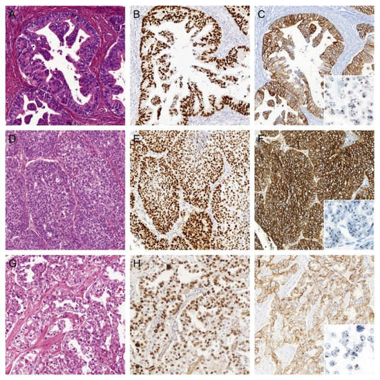 Three examples of HER2-positive endometrial cancers (EC) of non-serous histology. (A) H&E of an EC diagnosed as International Federation of Gynecology and Obstetrics (FIGO) grade 2 endometrioid EC (EEC) with (B) aberrant mutant-like p53 immunostaining, (C) strong (in)complete membranous HER2 immunostaining, and HER2 gene amplification by dual in situ hybridization (DISH). (D) H&E of an EC diagnosed as FIGO grade 3 EEC with (E) aberrant mutant-like p53 immunostaining, (F) strong complete membranous HER2 immunostaining, and HER2 gene amplification by DISH. (G) H&E of an EC diagnosed as endometrial clear cell carcinoma with (H) aberrant mutant-like p53 immunostaining, (I) strong complete membranous HER2 immunostaining, and HER2 gene amplification by DISH. All images ×20 objective magnification.
