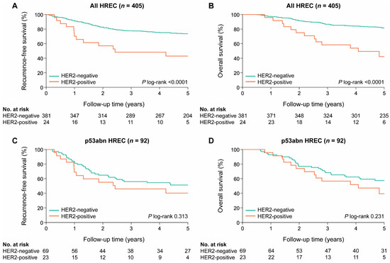 Kaplan–Meier survival curves for 5-year (A) recurrence-free survival (RFS) and (B) overall survival (OS) for PORTEC-3 patients with HER2-positive and HER2-negative high-risk endometrial cancer (HREC); 5-year (C) RFS and (D) OS for patients with HER2-positive and HER2-negative p53 abnormal HREC.