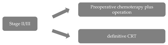 Treatment strategies for stage II/III ESCC, adapted and modified from guidelines of the Japan Esophageal Society. ESCC, esophageal squamous cell carcinoma; CRT, chemoradiotherapy.