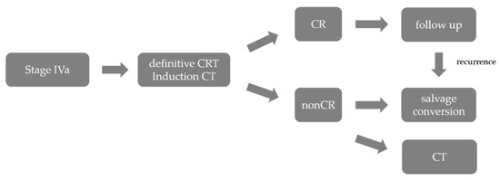 Treatment strategies for stage IVa ESCC, adapted and modified from guidelines of the Japan Esophageal Society. ESCC, esophageal squamous cell carcinoma; CRT, chemoradiotherapy; CT, chemotherapy; CR complete response.