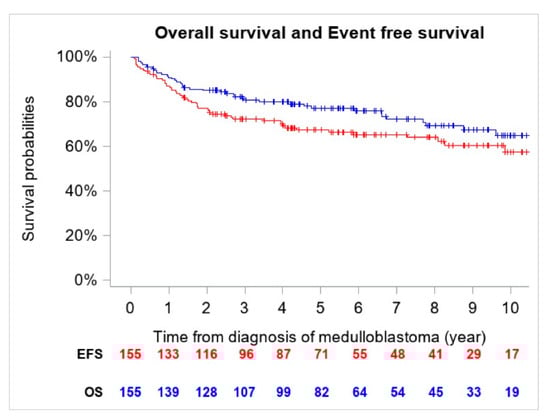 The management of medulloblastoma (MB) has evolved over the last three decades as a result of prospective multicentric clinical trials. Multimodal treatment including surgical resection, radiotherapy (RT) and chemotherapy (CT) has led to an improvement of outcomes with around two thirds of the patients being long-term survivors [1]. Treatment outcome is strongly associated with patient age and a series of established and evolving clinicopathological characteristics including metastatic disease, histology, postoperative residual disease (< or ≥1.5 cm2), MYC amplification status and more recent molecular features [2,3,4,5]. Five-year overall survival (OS) for standard-risk patients, typically defined as patients older than 3 years of age at diagnosis, who have a gross total resection of their tumor and are non-metastatic at diagnosis, ranges between 70–85% [6,7,8,9]. Patients who are younger than 3 years of age, have a subtotal resection (residual disease of >1.5 cm2) and/or are metastatic at diagnosis are considered to be “high risk” and often have a five-year OS <70% [10,11].