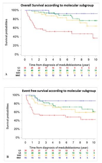 Despite the advances in MB therapy, relapsed MB represents a major therapeutic challenge in pediatric neuro-oncology patients. Outcome after relapse remains variably poor with survival rates less than 10% at 5 years, except in patients who did not receive RT at diagnosis [12,13,14,15]. Interestingly, Ramaswamy et al. [16] showed that relapsed tumors retain their original molecular characteristics and that the pattern of relapse is subgroup dependent.